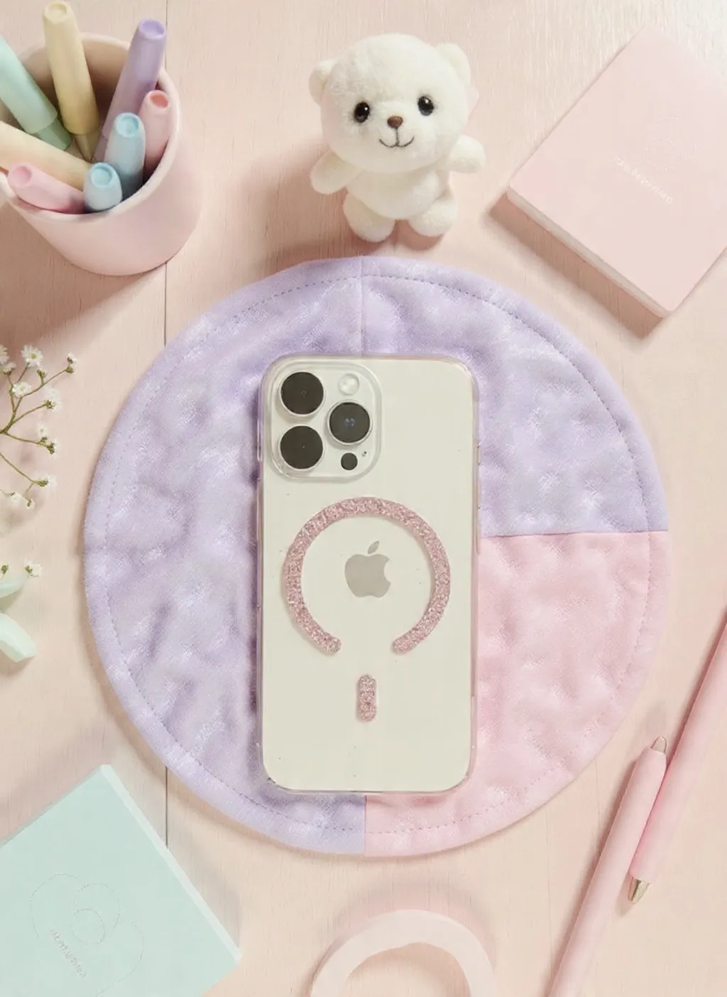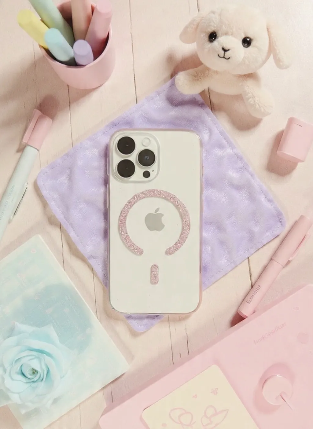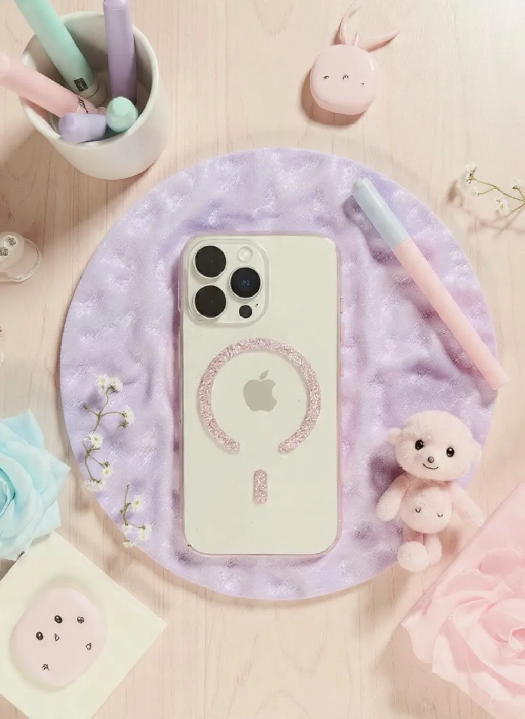 Crystal Glitz MagShell is a clear, slim case that lets your iPhone’s original color shine while adding a halo of soft pink glitter around the MagSafe ring. The crystal-clear back resists yellowing and scratches, and the glitter accents give your phone a luxe, feminine sparkle without feeling over the top. Reinforced corners and raised edges help protect the screen and camera from everyday drops and table scratches, while precise cut-outs keep all buttons and ports easily accessible. Perfect for anyone who wants a lightweight, girly look with full MagSafe compatibility for chargers and accessories.