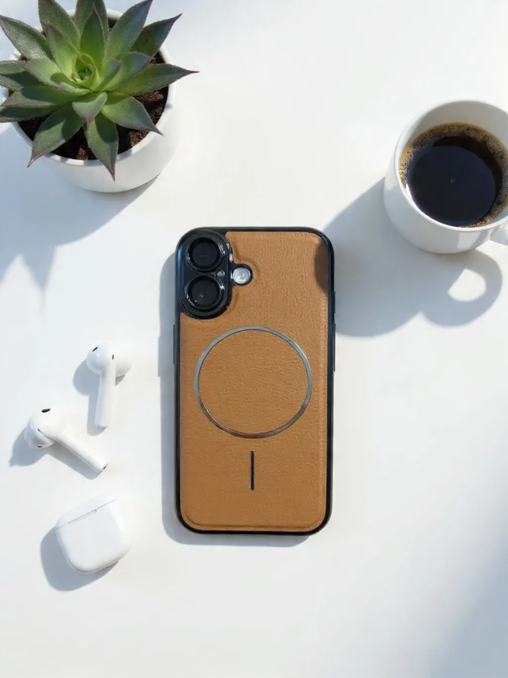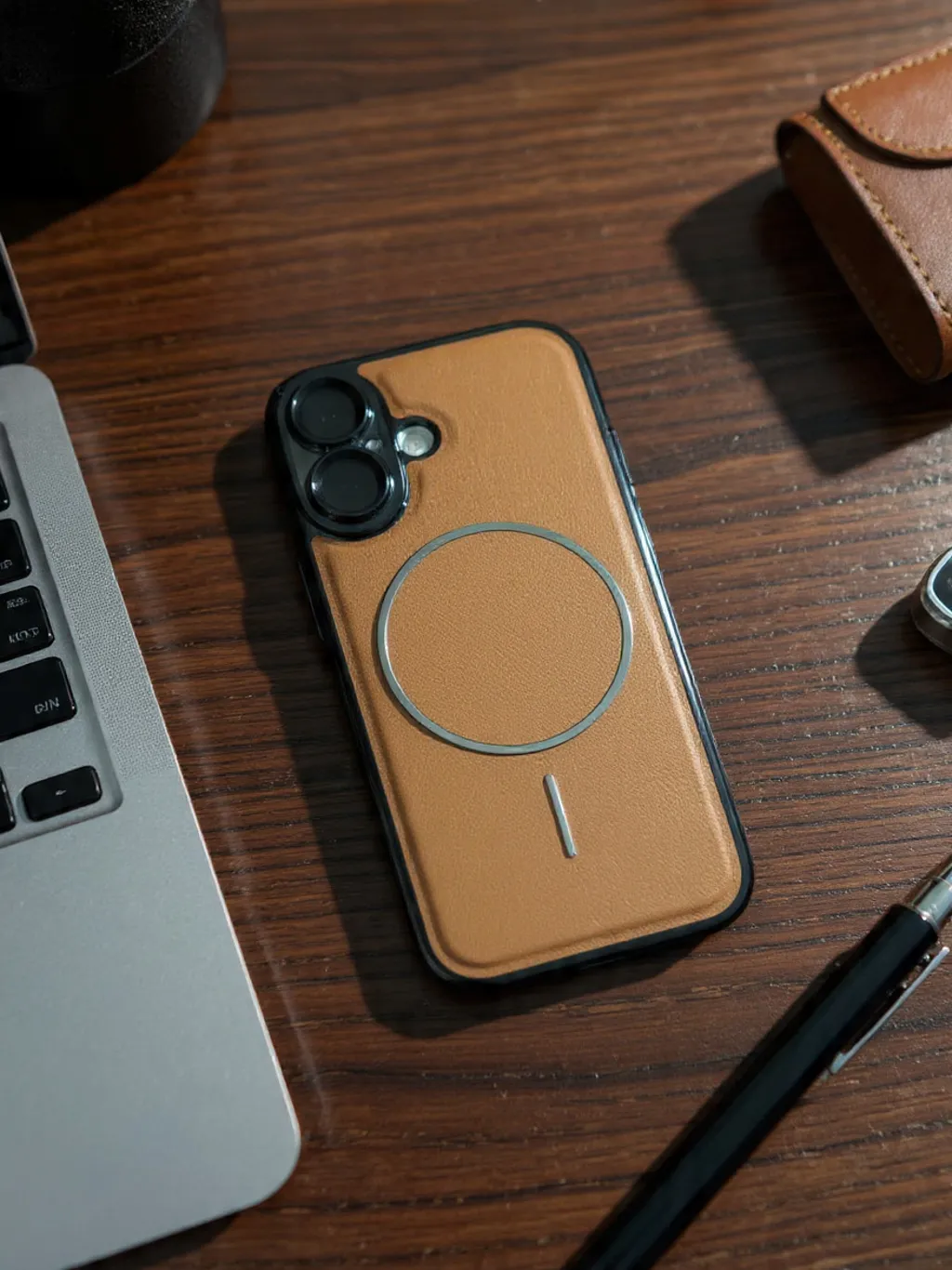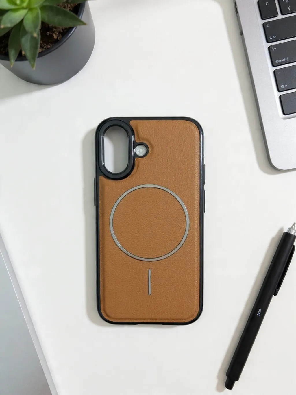 Urban Leather Skin Mag Safe Case wraps your iPhone 16 in smooth, latte‑tan leather for a warm, refined everyday look. A built‑in Mag-Safe ring is subtly embedded under the leather, keeping charging effortless and accessories locked in place. Slim black edges frame the design, adding grip, drop protection and a clean contrast that suits both work and weekend setups.